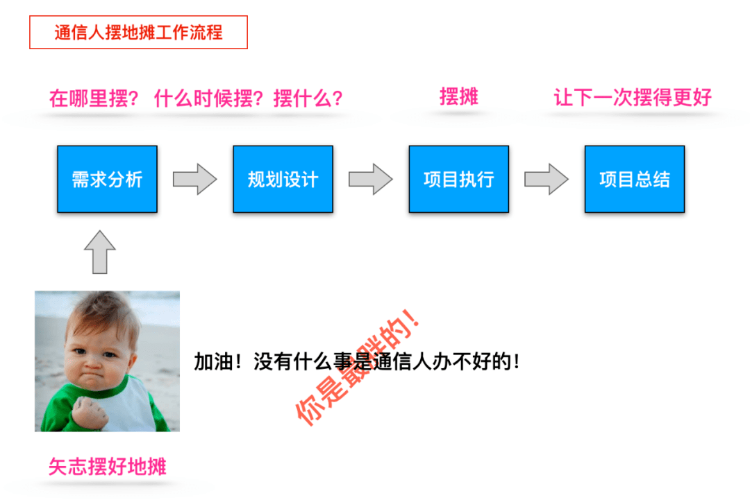 擺地攤是一項系統工程,每一個環節都不能馬虎,總的來說,分為需求分析、規劃設計、項目執行和項目總結四大步驟。